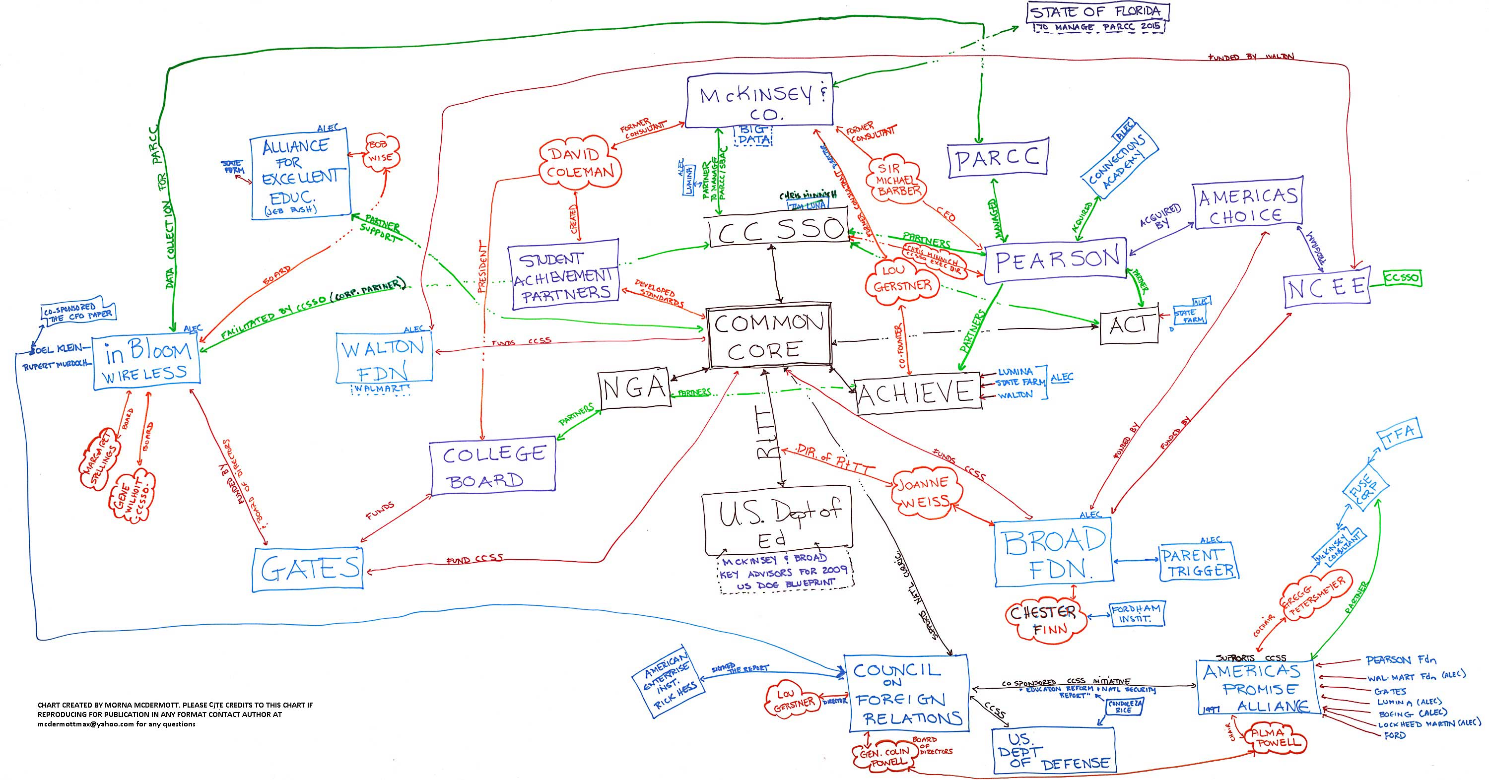 Morna McDermott, who has appeared on the Education Town Hall several times, has been exploring the many Common Core corporate relationships. Her diagram and detailed explanation has been cited by many following this topic.