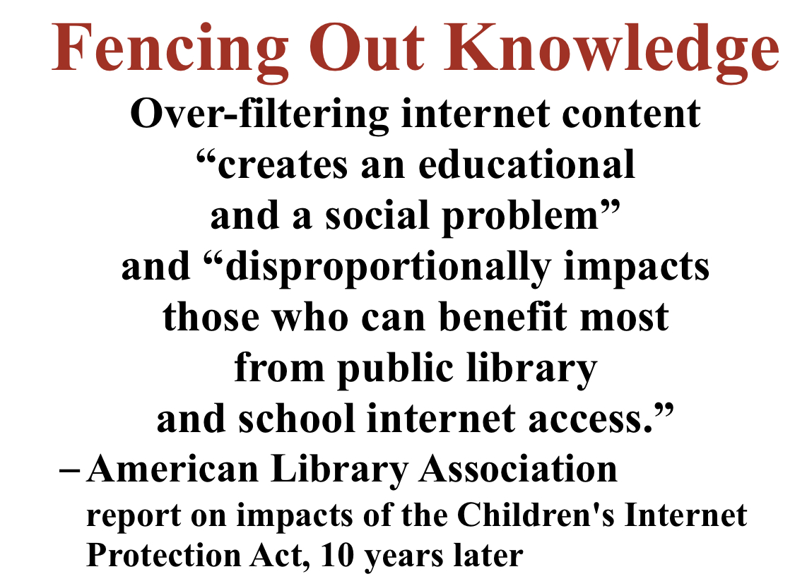 Over-filtering of internet content, sometimes due to misinterpretation of legal requirements, is common, according to the ALA’s “Fencing Out Knowledge” report. Based on research and two national symposia, the report finds that over-filtering “blocks access to legitimate, educational resources while often failing to block the images proscribed by the law,” and “disproportionally impacts those who can benefit most from public library and school internet access—the 60 million Americans without access to either a home broadband connection or smartphone.”