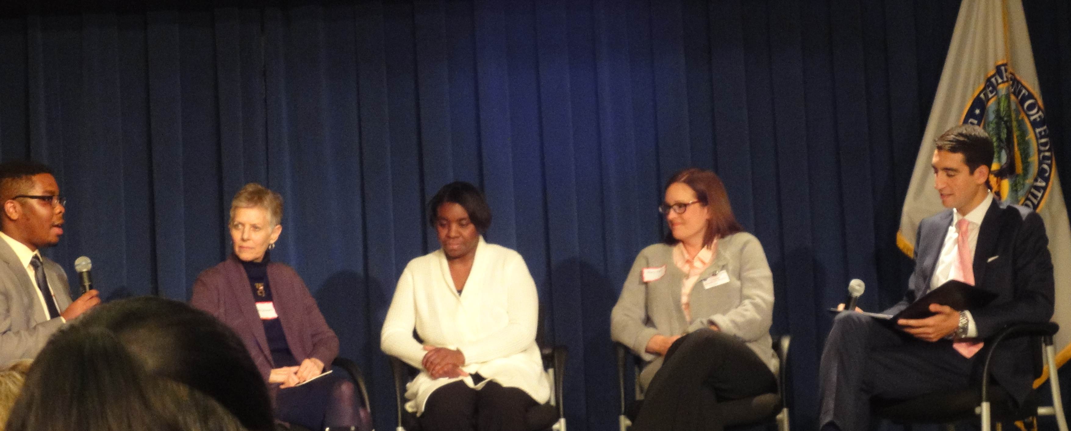 U.S. Dept. of Ed panel on “Beyond the Wall” with (L-R) student Jeffrey Wood; mentor, Sally Schwartz; mother, Pamela Bullock; teacher, Stacey Yule; and Dpty Asst Secy, Mohamed Abdel-Kader