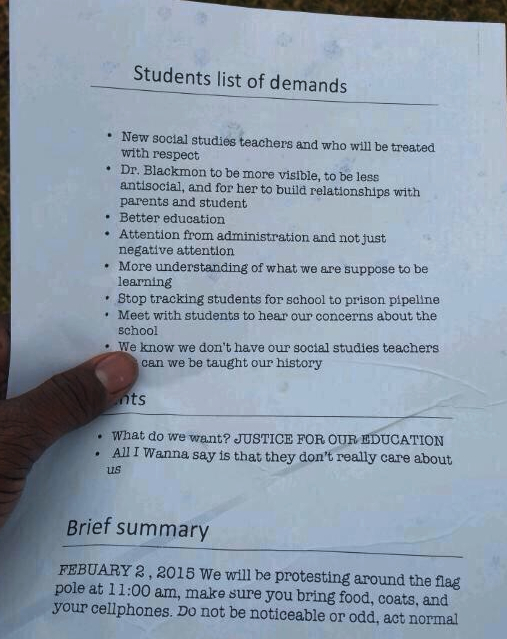 Student demands include “better education,” “more understanding of what we’re supposed to be learning,” plus better administration, discipline, and the teaching of social studies.