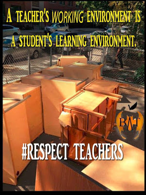 In addition, Flanagan tells of the Bronx principal — at the school across the street from his — who removed (and later returned) all teacher desks in what some describe as a retaliatory move. Assuming at first that colleagues were receiving new furniture delivery, he learned instead that this odd order left teachers without a place to store personal belongings, grade papers, or plan lessons. Moreover the spectacle of desks being removed mid-day, in disruption of classes and disrespect of teachers, was witnessed by students. BATs stress that teachers’ working environments are also children’s learning environments.