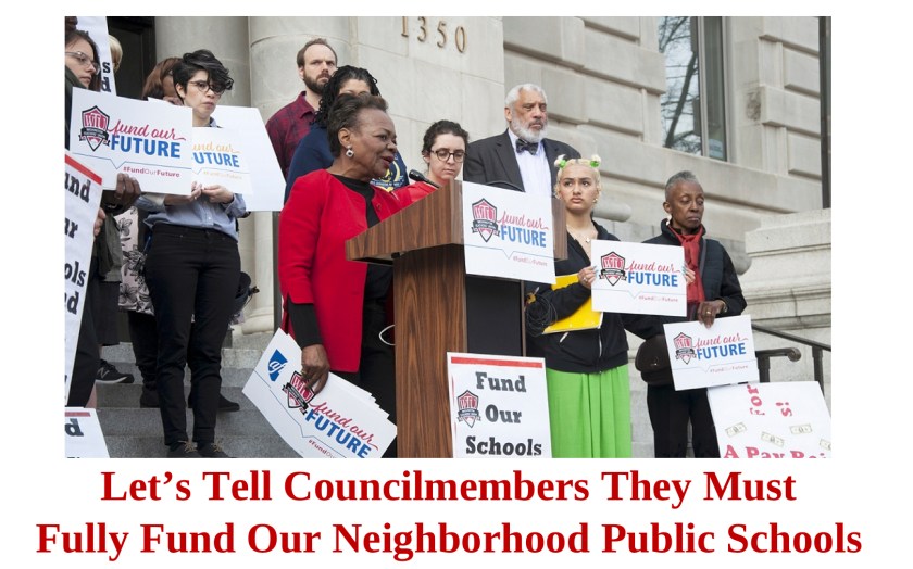 The Washington Teachers Union calls on all concerned: “Demand that the DC Council amend the proposed FY 2020 DCPS budget to fully fund our schools. If the proposed budget is not amended, our schools could lose millions of dollars.”