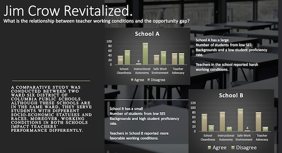 “Jim Crow Revitalized: What is the relationship between working conditions and the opportunity gap?” Teaser for the research document shows two small bar graphs with captions — see PDF for full information — plus synopsis of the research: “A comparative study was conducted between two Ward Six District of Columbia Public Schools. Although these schools are in the same ward, they serve students with different socio-economic statuses and races. Moreover, working conditions in both schools impact teachers’ performance differently.”