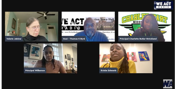 Image is YouTube thumbnail showing following faces and screen names: Valerie Jablow, Host — Thomas Byrd, Principal Charlette Butler-Strickland, Principal Wilkerson, and Kristie Edwards
